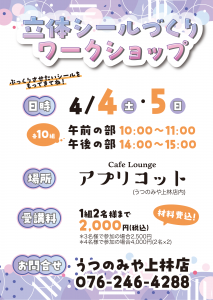 この度うつのみや上林店内の「Cafe Lounge アプリコット」にてお子様から大人まで楽しめる『立体シール作りワークショップ』を開催いたします。